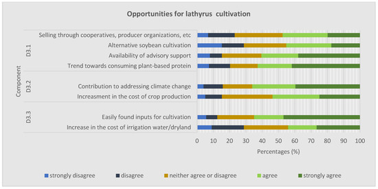 Opportunities for lathyrus cultivation per principal component (D3.1: “Value Chains and Advisory Support”, D3.2: “Economic and Environmental Sustainability”, D3.3: “Availability of Inputs”).