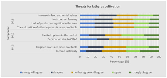 The first component explained 40.6% of the total variance and included 4 variables with high positive loadings (Cronbach’s α = 0.850). These variables concerned the low recognizability of lathyrus products in the study area. Additionally, they discuss the difficulties brought on by growing land prices and rents as well as the lack of contractual farming, which forces people to choose alternate crops. Due to the nature of these variables, the component (D4.1) was named “Institutional Constraints and Recognizability”.