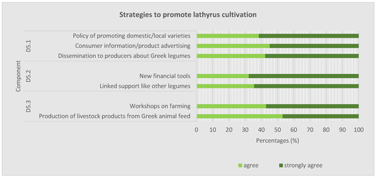 The third component (D1.3), explaining 11.8% of the total variance, included only the variable “Utilization of Degraded Soils” (Cronbach’s α = 0.616). Therefore, it was named accordingly. This variable concerned the possibility for cultivation of lathyrus in marginal and degraded lands with reduced soil fertility, which are unsuitable for other crops.