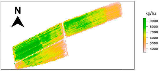 Yield map over the study area (the data are estimations of real yield; the combine’s speed could have impacted both the overall accuracy as well the calibration of the sensors that were reserved).