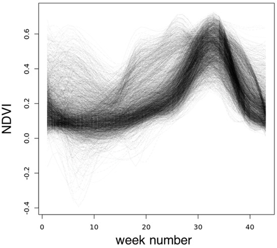Example of spline representation of the NDVI index over the fields. x-axis represents the week number from first image. On the y-axis, we report the value of the NDVI index.