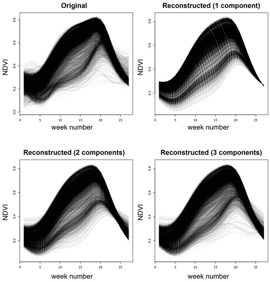 Different configurations of reconstructed time series using the FCPA. Top left: original set of curves. Top right: reconstructed using 1 component. Bottom left: reconstructed using 2 components. Bottom right: reconstructed using 3 components. The x-axis represents the week number from first image. On the y-axis, we report the value of the NDVI index.