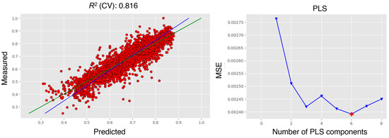 Left: scatter plot of predicted and measured scaled yields. Blue line is the best fit line while the green one represents the 1:1 line. Yield values are normalized in the interval 0–95th percentile. Right: trend of MSE according to the number of PLS components (in that case, six components represent the optimal choice).