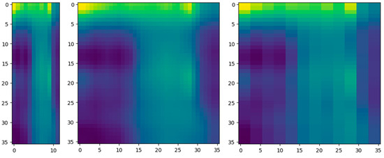 Left: example of image generated from a pixel using the week as unit. Middle: resampling to square size using linear interpolation. Right: resampling to square size using nearest-neighbor interpolation.
