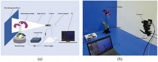 To address the occlusions and overlaps between flowers in two-dimensional (2D) images, it was necessary to enhance the model’s ability to detect occluded flowers at the algorithmic level and to obtain multiple viewpoints that can comprehensively display all blooms and buds of a potted Phalaenopsis plant, particularly in cases with heavy occlusions and overlaps. To this end, a multiviewpoint imaging system was first designed to collect potted Phalaenopsis images from multiple viewpoints.