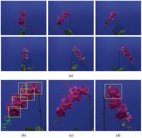 With the help of the multiviewpoint imaging system, image acquisition tests of 33 potted Phalaenopsis samples were conducted at the South China Agricultural University in Guangdong Province in March 2023. The actual working scene of the multiviewpoint imaging system is shown in Figure 2b. The samples, produced by the Environmental Horticulture Research Institute, Guangdong Academy of Agricultural Sciences, were of the “Big Chili” species, with a cultivation period of 24 months. Due to the variable growth directions, inconsistent flowering angles, irregular shapes, and large differences in the sizes of blooms and buds of Phalaenopsis plants, occlusions and overlaps are common occurrences.