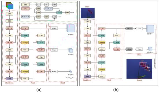 As shown in the comparison between Figure 4a,b, the design of the two-scale detection branch involved the following steps. The C3 on the 9th layer of the backbone, which was mainly used to extract features for predicting large targets, was removed. The 22nd-layer convolution block, 23rd-layer concatenation (Concat) and 24th-layer C3 at the neck, which were combined to fuse and enhance features for detecting large targets, were also deleted. The prediction branch with a shape of 20 × 20 × 24 at the head was removed because it was no longer necessary for predicting large-scale targets.