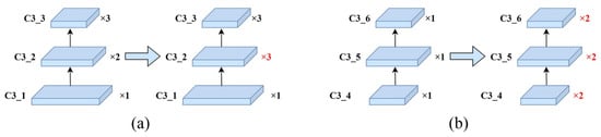 In the neck, all C3 modules are attached after concatenation operations to integrate features and further learn the fused features; this is because the neck’s function is to merge shallow graphic features with deep semantic features to obtain more comprehensive features. As a result, adjustments to the number of bottlenecks in the neck should be synchronized. To avoid excessive network depth and numerous redundant gradients, the number of bottlenecks at each C3 stage in the neck was ultimately optimized from 1-1-1 to 2-2-2, as shown in Figure 5b.