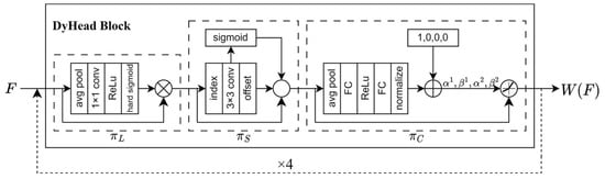 The detailed implementation of DyHead is shown in Figure 6. The DyHead block can be stacked multiple times according to Equation (1), in order to achieve different performances. In this study, the attention integration module was stacked four times.