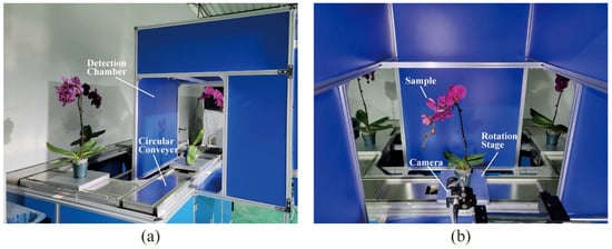 Conveyor system with a detection chamber to count Phalaenopsis plants: (a) the overall structure of the circular conveyer; and (b) the internal configuration of the detection chamber.