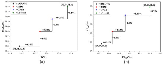 As shown in Table 3, when the improvements were sequentially removed, the F1 values decreased by 0.34%, 0.56% and 0.25%, respectively, while the mAP50 values decreased by 0.8%, 0.9% and 0.5%, respectively. These results indicate that all three components contributed to the enhancement of model performance.