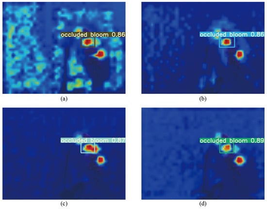 To better understand each improvement, Grad Class Activation Mapping (Grad-CAM) [40] was employed to visualize the differences in network feature extraction of each improvement. The Grad-CAM technique utilizes the gradient information from the feature map before the prediction layer in the network to determine the significance of each feature point for the target detection. As can be observed in Figure 9a,b, the two-scale detection branch eliminated the excess parts activated in the original background, indicating that this improvement enabled the network to focus more on targets. The difference between Figure 9b,c is that the features of another occluded bloom next to the predicted occluded bloom were deeply activated, demonstrating the enhancement of feature representation capability brought about by optimizing the number of bottlenecks. The change between Figure 9c,d is that the two originally adhered occluded blooms were separated and the features of the bloom at the edge were more activated, albeit to a lesser degree; this sufficiently demonstrates that the integration of DyHead directed more attention toward features conducive to recognizing occluded blooms.