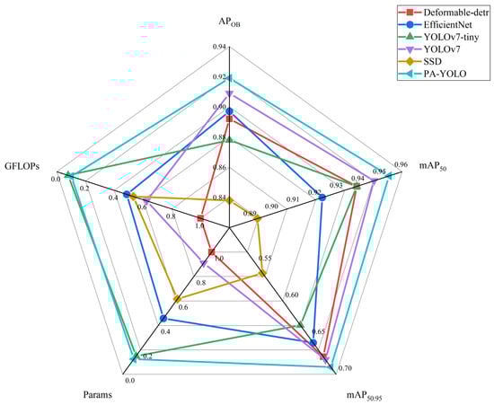 To thoroughly validate the performance of the proposed detection algorithm, PA-YOLO was benchmarked against representative target detection algorithms, including one-stage networks such as SSD [41], RetinaNet [42], the YOLO series and RTMDet [43]; two-stage networks such as Faster R-CNN [10] and Cascade R-CNN [44]; and popular transformer-based models such as Swin Transformer [45] and DETR [46]. Experiments were conducted using a consistent training set on identical hardware, with the models evaluated on the same test set.