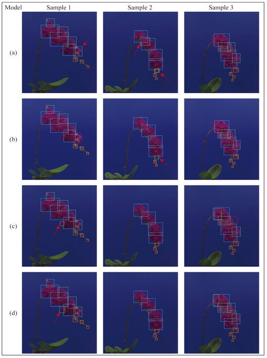 Detection instances of four best models: (a) YOLOv5s; (b) Deformable DETR; (c) YOLOv7; and (d) PA-YOLO. The blue, green and orange rectangular boxes represent normal blooms, occluded blooms and buds, respectively. The red arrows point to targets of incorrect detection. The red dotted circles highlight the undetected targets.