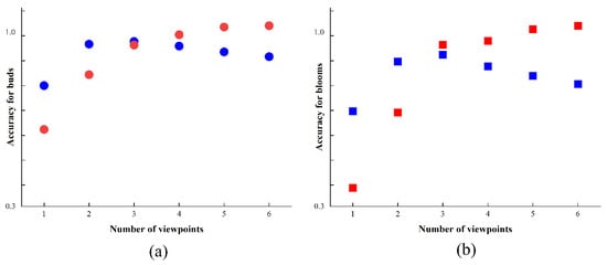 Viewpoint counting accuracy of 23 samples under different numbers of viewpoints: (a) average accuracy for buds, where red and blue represent trends including 18 and 5 samples, respectively; and (b) average accuracy for blooms, where red and blue include 9 and 14 samples, respectively.
