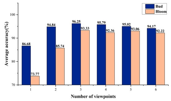 By partitioning the 360-viewpoint images from each potted Phalaenopsis sample into groups corresponding to the number of viewpoints, we calculated the viewpoint counting accuracy of the buds and blooms for 23 plant samples under different numbers of viewpoints, as illustrated in Figure 12. Both the buds and blooms exhibited two trends in the counting results. One trend, depicted as blue points in Figure 12a,b, showed that counting accuracy first increased sharply and then decreased slightly, with an inflection point occurring at two viewpoints for buds and three viewpoints for blooms. The other trend, depicted as red points in Figure 12a,b, was that the counting accuracy continued to rise with increasing numbers of viewpoints until reaching 100% at six viewpoints. The observed trends distinctly delineate the implications of duplication detections and missed detections on the process of counting. The detrimental effects of duplication detection on the counting accuracy are highlighted in the first trend. Conversely, the second trend underscores the efficacy of employing multiple viewpoints in mitigating issues related to missed detection. For a comprehensive measure, an average was computed for the viewpoint counting accuracy across all samples, as shown in Figure 13. The highest average counting accuracy occurred at three viewpoints, reaching 96.25% and 93.33% for the buds and blooms, respectively; this indicates that setting the number of viewpoints to three was optimal for counting. Furthermore, even when the accuracy of other numbers of viewpoints was not maximal, it remained significantly higher than that of a single viewpoint. This finding is unsurprising, as increasing the number of viewpoints generally results in improved accuracy. However, the results from this study indicate that a higher number of viewpoints was not always better, as accuracy might decrease slightly as the number of viewpoints increased.