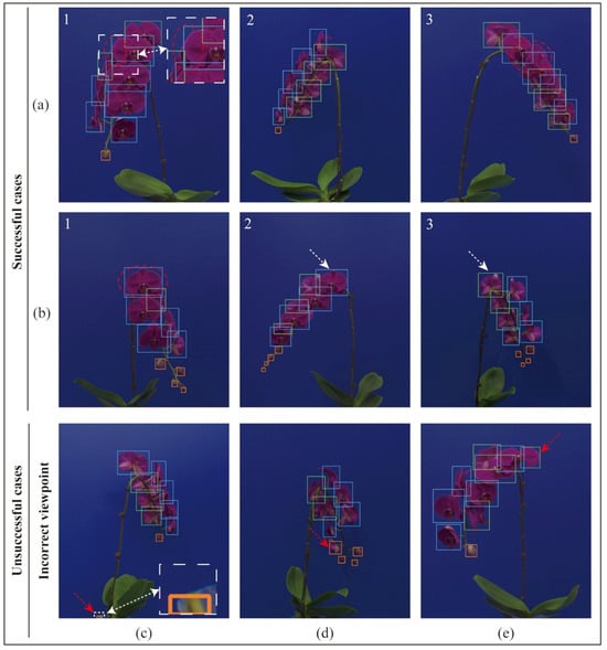 Figure 14 illustrates two successful counting cases and three of four unsuccessful counting cases. In viewpoint 1 and viewpoint 3 of Figure 14a, two heavily occluded blooms were not detected, as highlighted by red dashed circles. However, in viewpoint 2, these blooms were successfully detected and the number of flowers was correctly counted. Viewpoint 1 of Figure 14b displayed an overlapped bloom that could not be detected, as depicted by the red dashed circle, while in viewpoint 2 and viewpoint 3, the target was successfully identified, as indicated by the white arrows. These observations demonstrated that the method proposed in this paper could effectively address scenarios with missed detections and achieve accurate flower counting. In contrast, Figure 14c–e show three key viewpoints resulting in unsuccessful counting cases under three viewpoints. All unsuccessful cases were attributed to the presence of duplication detections. Cases c and d in Figure 14 resulted from similarities in color and shape, leading to the misidentification of a small part of the exposed root and a back-facing bloom as buds. Case e resembled the scenario depicted in sample 1 of Figure 11d, where the model’s robust feature learning capability rendered it overly sensitive to occluded blooms. Furthermore, this bloom differed in shape from the others, with its lower petal curling backward and its overall form being less compact, causing the model to perceive it as two separate blooms. The remaining unsuccessful counting case not shown in Figure 14 is almost the same as case Figure 14e.