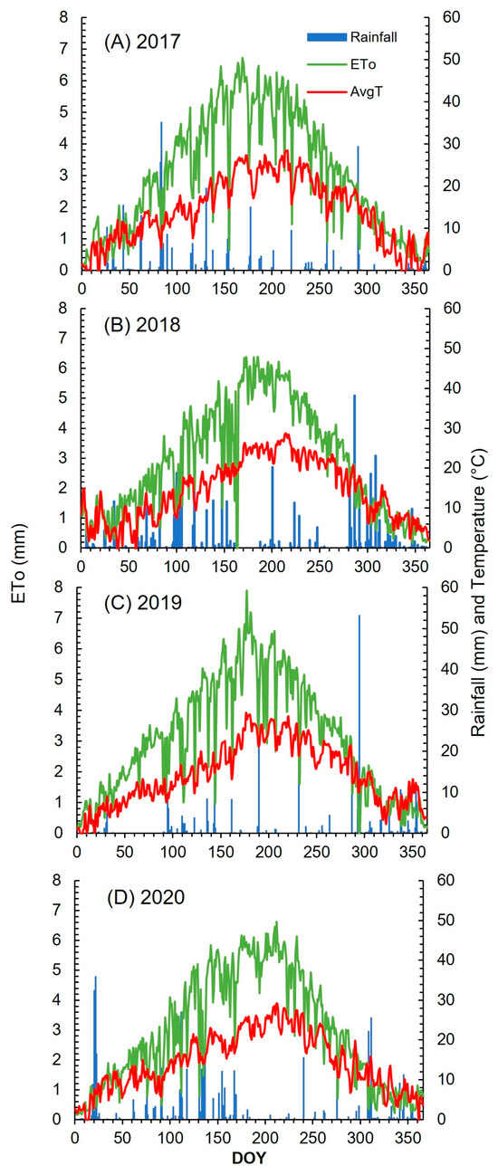 - Allen, R.G.; Pereira, L.S.; Raes, D.; Smith, M. FAO Irrigation and Drainage Paper No. 56—Crop Evapotranspiration; FAO: Rome, Italy, 1998; ISBN 978-92-5-304219-7. [Google Scholar]
