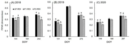 | Post-forcing FIPAR (dimensionless) | 2019 | 0.38 a | 0.39 a | 0.30 b | 0.33 ab | ** | ns | ns |