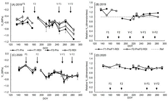 3.4. Experiment 2: Irrigation and Vine Water Status