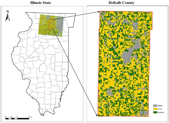 The study area is situated in DeKalb County, northern Illinois, USA, covering an area of approximately 1645 square kilometers (Figure 1). Illinois stands as a leading agricultural state in the United States, with 80% of its land dedicated to agricultural purposes. The average cultivated land per household is 140 hectares (around 2100 acres), predominately featuring major crops such as corn and soybeans.