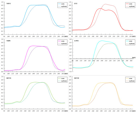 During the crop growth period, which spanned 218 days, we calculated 40 periods of data for each vegetation index. In order to obtain a time-continuous complete vegetation index curve and use it for subsequent crop growth curve extraction, this study uses a flexible fitting (Flexfit) algorithm to fill in the missing data between the 40 periods of data for each vegetation index to generate daily continuous vegetation index data [31]. The Flexfit method is capable of addressing significant temporal gaps within time-series data, facilitating both data noise elimination and data smoothing. Diverging from conventional Savitzky–Golay (SG) filtering methods reliant on fixed time windows, the Flexfit tool exhibits versatility by employing more extensive time windows. This flexibility proves particularly advantageous for accommodating the 40-day period under examination in this study, wherein period data are extrapolated to yield a complete daily dataset spanning 218 days. Following rigorous testing, the parameters for Flexfit fitting in this study were established as follows: the spike threshold, increase weight, and number of iterations for filling large gaps were set to 3, 2, and 3, respectively. Additionally, the minimum number of samples for smoothing was determined to be 5, while the maximum search window size was capped at 60. Subsequently, we randomly selected 20 sample points for corn and soybean utilizing the confidence layer of CDL data with confidence levels surpassing 0.95. These sample points were then overlaid onto the fitted time-series vegetation index data to extract 20 curves for each crop. Following a meticulous screening process, certain curves whose shapes deviated from the majority, owing to poor fitting results, were eliminated. Ultimately, only 10 curves were retained as crop growth curves for each crop. Figure 2 illustrates the average crop growth curve of the six vegetation indices for enhanced presentation.