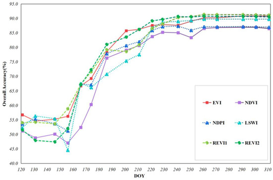 The results in Figure 3 illustrate that, with an increase in the number of input image data (corresponding to the passage of time on the horizontal axis), the overall classification accuracy of the six vegetation indices exhibits a consistent pattern of initial improvement followed by stabilization. Prior to early June (around DOY156), the classification accuracy generally remained below 60%, indicative of the emergence stage of the crops. Subsequently, as time progressed, there was a continuous enhancement in the classification accuracy of the six vegetation indices. By the conclusion of August (around DOY 241), during the grain-filling maturity stage of the two crops, peak accuracy of approximately 90% was achieved. Post this period, the classification accuracy of various vegetation indices remained stable.