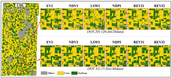 Notably, in mid-to-late July (around DOY 201), several vegetation indices demonstrated a notable proficiency in distinguishing between corn and soybeans, achieving an acceptable high classification accuracy of 80%. Specifically, on 5 July (DOY 186), the classification accuracy of REVI2 reached 81%, and on 20 July (DOY201, see Figure 4), EVI achieved a recognition accuracy of 85.7%. Overall, throughout the growing season, EVI and the two red edge indices consistently yielded the best classification results across different input image numbers, followed by NDPI and LSWI indices. The classification performance of the NDVI index was relatively weak.