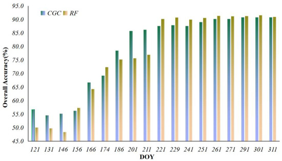 Early crop identification accuracy based on crop growth curves (CGC) and RF.