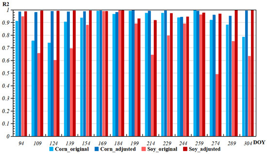 - Shen, Y.; Zhang, X.; Yang, Z. Mapping corn and soybean phenometrics at field scales over the United States Corn Belt by fusing time series of Landsat 8 and Sentinel-2 data with VIIRS data. ISPRS J. Photogramm. Remote Sens. 2022, 186, 55–69. [Google Scholar] [CrossRef]