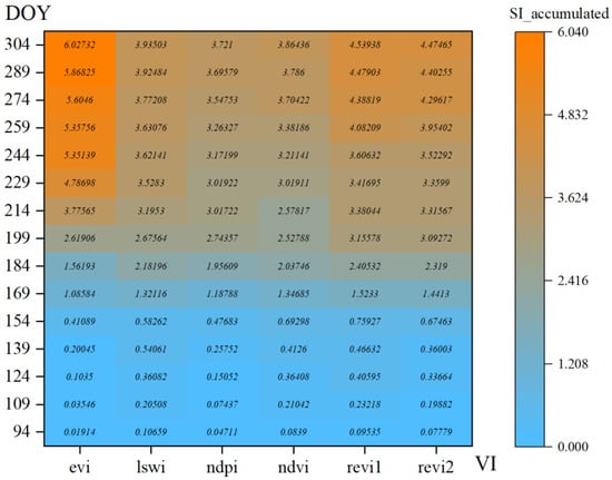 Figure 7 illustrates a heat map depicting the cumulative separability index values of six vegetation indices. The numerical values within each rectangle in the figure correspond to the accumulated separability index of the vegetation index represented by the column in which the rectangle is located, ranging from DOY 94 to the DOY, corresponding to the row position of the rectangle. Notably, it is observed that prior to DOY184, the cumulative SI of the six vegetation indices exhibits minimal variations. Subsequently, discernible differences emerge. Particularly noteworthy is the pronounced change in the cumulative SI of EVI, with the most significant variation occurring after DOY184. The EVI attains its highest cumulative SI value towards the end of the period (DOY 304), signifying its superior capability in distinguishing between corn and soybean. The cumulative SI values of the two red-edge indices exhibit similar changing patterns, with REVI1 demonstrating a slightly higher SI value than REVI2. Additionally, the cumulative SI value of LSWI surpasses that of both NDVI and NDPI. Importantly, these findings align closely with the previously observed changes in classification accuracy during the early identification of crops using the six vegetation indices (Figure 3), providing further evidence of the performance disparities among them in distinguishing between the two crops.