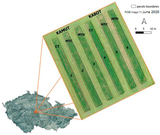 The images were processed in Pix4D SW (Pix4D S.A., Lausanne, Switzerland), where spectral indices (details in Table 3) were calculated. The resulting indices in the form of raster data (GeoTIFF, WGS84 UTM Zone 33N coordinate system) were analyzed in QGIS SW using zonal statistics and advanced tools focused on individual parcels. A Digital Terrain Model (DTM) was derived from the orthophoto in m above sea level (a.s.l.). The data were then statistically processed in Statistica SW (TIBCO Software Inc. (2018) Statistica (data analysis software system), version 13. http://tibco.com).
