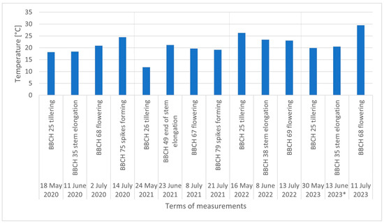 Temperature at time of measurement (°C) and growth stages at the time of scanning. * measured only with multispectral Micasense RedEdge MX camera, not with Duet T camera, due to bad meteorological conditions.