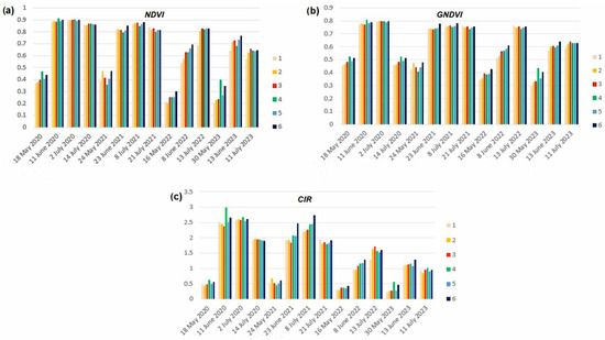 Evaluation of selected spectral indices: Normalized Difference Vegetation Index (NDVI), Green NDVI (GNDVI), and Chlorophyll Index Red Edge (CIR) for monitored seasons. 1–3: Khorasan variety; 4–6: Kabot variety; 1 and 4: conventional tillage; 2 and 5: minimum tillage; 3 and 6: minimization tillage.