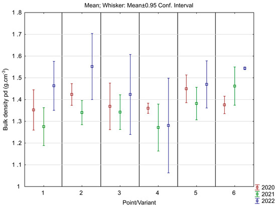 All years showed interesting results in the ploughed variants. In the first year, the CT variants had the lowest values of bulk density, followed by MTD with almost the same average values, and the highest values of bulk density were measured for MTC tillage. The second year (2021) differed in the swapping order of the MTD and MTC variants. This means that the order from lowest to highest in the second year was CT, MTC, and MTD, where the variant sown with the Kabot variety with MTD tillage showed significantly higher values than other variants, with a statistically significant difference compared to the CT variants.