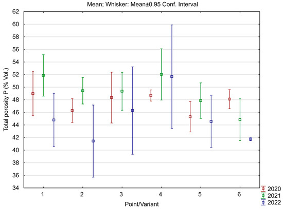 In the last measured year, 2022, the variant sown with Khorasan wheat copied the or-der of the year 2021, where the lowest values were for CT followed by MTD and the highest value of bulk density was for MTC. In contrast to the second variant sown with Kabot wheat, the MTD tillage system performed the worst. However, the best results were achieved mainly in ploughing, which agrees with most authors [60,61,62]. On the other hand, variants 3 and 6 (MTD—Khorasan and Kabot) were almost identical to CT in terms of bulk density in the first year of the experiment. This could suggest that under certain conditions (such as soil type, temperature, precipitation, crop, etc.), some no-tillage technologies can achieve the same [16], and perhaps in some cases better, results than CT [63]. This was also stated in the publication by Woźniak and Rachoń [52], where suitable soil conditions for plant growth were created by CT mainly on medium-moist soils, while on dry and semi-arid soils, it was better to choose systems without plowing. A graph of the total porosity from the experimental plots can be seen in Figure 5. The porosity results were in good agreement with the bulk density results during the monitored years. In years when greater bulk density was measured, porosity was measured to be lower and vice versa.