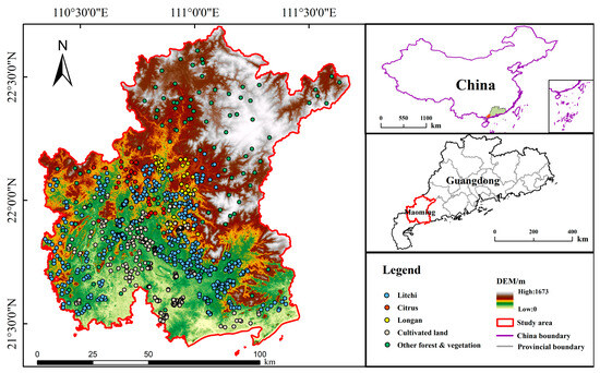 A total of 1156 field sampling sites were investigated, comprising 724 sampling sites for litchi and 432 sampling sites for non-litchi (Figure 1). The investigation was carried out in townships and areas surrounding large citrus cultivation areas within the study area. The non-litchi sampling sites consisted of five main features, i.e., citrus, longan, cropland, and other forest and vegetation. One third of the field sampling sites were selected for the construction of the growth stage characteristics of orchard vegetation, while the remaining sites were used for accuracy evaluation. Because of the large area of agricultural land and the many types of crops in the central and southern plains, there were more field sampling sites in and around the townships in the central and southern parts of the study area. In contrast, the northern part of the study area was predominantly hilly and forested, with a comparatively limited area devoted to the cultivation of litchi and other fruit trees. As a result, fewer field sampling sites were investigated within these regions.