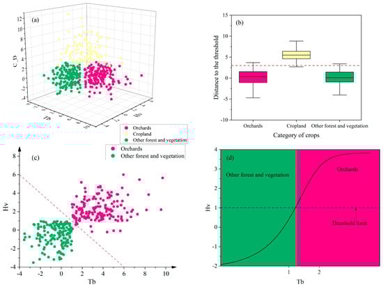 Separability of orchards, cropland, and other forest and vegetation: (a) separability of orchards, cropland, and other forest and vegetation in 3D feature space; (b) distance box plot of each vegetation type to the optimal threshold plane; (c) scatter plot of divisibility of orchards and other forest and vegetation species; (d) knowledge model diagram of optimal identification features of orchards and other forest and vegetation. Sentinel-1 (S-1) data were used to make divisions among orchards, cropland, and other forest and vegetation. represents the difference in backscattering coefficient between the 13 June data and the 25 June data; refers to the high valley value of the backward scattering coefficients of the 14 May, 26 May, and 7 June data for the six polarizations and their combinations; represents the difference between the backscattering coefficient of the data of 7 June and those of 14 January.