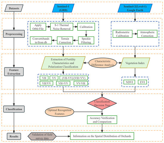 In addition, current methods of mapping fruit trees primarily rely on the spectral features and spatial features of fruit trees, which may not be the most optimal features for the identification of specific fruit tree species because of the comparable spectral and spatial features. To establish optimized features that preserve the classification accuracy and reduce the computational cost, various studies have reported optimal feature selection by different methods [19] (e.g., random forest, convolutional neural networks (CNNs), artificial neural networks (ANNs), extreme gradient boosting, recursive feature elimination [20,21]), which may result in varying optimal feature subsets for the same identification task. Numerous studies have shown that the random forest, CNN, and ANN methods have higher accuracy and better performance in classification [21]. However, as a nonparametric supervised learning approach for classification and regression problems, the decision tree has been proven more effective in distinguishing various types of vegetation [22]. The spatial structure of the orchards of evergreen fruit trees in tropical and subtropical regions is similar, and the variety of fruit tree species leads to similar visible spectral information, which can easily cause confusion and brings difficulties to the identification of fruit trees [23,24,25]. Therefore, the identification of perennial fruit trees requires the use of Sentinel-1 (S-1) data, and synthetic aperture radar (SAR) is highly sensitive to structural changes in the canopies of fruit trees [22]. The construction of backward scattering coefficient models for long time series under S-1 polarization conditions, the comparative analysis of the growth cycles of different fruit trees, and the search for their growth stage characteristics for identification [26,27] are important tasks. However, it may be challenging to distinguish different objects when they share similar backscattering characteristics [2]. In this case, a single piece of S-1 data would not be able to distinguish the different features; thus, there is a need to combine this with visible data and use the spectra of the two different data to differentiate between features that are easily intermixed under the same growth stage feature [28,29]. The mapping of fruit trees is significantly affected by the validity of observations, which must be available to accurately describe the fruit tree phenology. However, many fruit tree morphological characteristics in tropical and subtropical regions are similar, making it easy to confuse them with single-time data [17]. For the identification of different fruit trees, the most important aspect is to construct a long time series to find the key features and determine the optimal identification features according to the sensitivity of the growth stage under different polarizations [2].