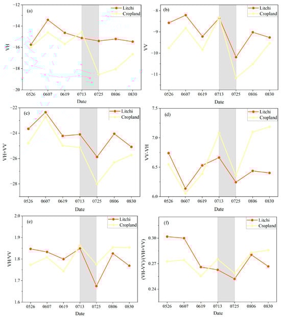 The discriminated characteristic parameters of litchi fruit trees and cultivated land with the most favorable results are presented in Figure 4 and Figure A1, as well as the results of the best discriminating characteristic parameters of litchi fruit trees and other forest and vegetation types under the six polarizations and their combinations, respectively. The coefficients for cropland on 13 July and 25 July showed significant disparity, as depicted in Figure 4a, and the range of the difference in cropland was three times greater than that of litchi, although litchi also showed a decreasing trend. Therefore, this growth stage characteristic was chosen as the optimal identification feature of the litchi fruit trees and cropland. From Figure A1a, it can be seen that the data of the litchi fruit trees showed a valley on 26 May, the data on 7 June recovered to the peak, and the height of the valley of other forest and vegetation was only half of that of the litchi fruit trees. Therefore, this growth stage characteristic was selected as the optimal recognition feature for litchi fruit trees and cropland.