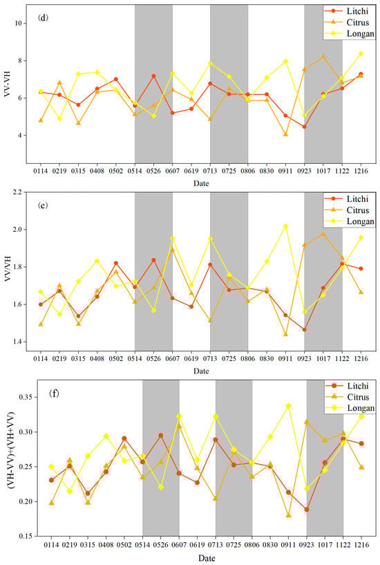 In this study, the time window for the differentiation of litchi, longan, and citrus fruit trees from other forests and vegetation was the respective maturity period, which was May–June for litchi, July for longan, and September–October for citrus [57]. The shading of foliage by expanding fruit during the ripening period can lead to the weakening of vegetation information [58]. The backscattering coefficient of fruit trees exhibits a discernible trough at the maturity stage, followed by a decreasing and then increasing trend. This characteristic differentiates fruit trees from other vegetation in the identified time frame. Among all the polarization combinations, the trend of identification features under VH polarization was the most obvious, and there was no strong separation between the identification features of the three types of fruit trees and other forest and vegetation in other polarization combinations [39,59]. Therefore, the identification parameters of fruit trees and other forests and vegetation were equally optimal under VH polarization.