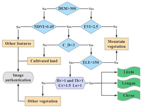The study area comprised two types of terrain: mountains and plains. Therefore, the first layer of the decision tree was based on the DEM data to separate the mountains and plains, and the area with DEM greater than 300 was recognized as a mountainous area by combining the high-resolution image, and the area with DEM lower than 300 was recognized as a plain. The sensitivity of mountains and plains to different vegetation indices is different, so, according to the sensitivity analysis of the vegetation indices, the EVI and NDVI, which were the most effective in distinguishing mountains and plains, were selected as the second layer of the decision tree. A value of 2.5 was selected as the threshold value of the EVI, and the range of fruit trees was defined as less than 2.5. Meanwhile, 0.45 was selected as the threshold value of the NDVI, the range of fruit trees was defined as less than 0.45, and the threshold value of the range greater than 0.45 was defined as the range of mountain vegetation. Cropland was mostly distributed in the plain area, and the third layer of the decision tree first distinguished cropland. To ensure that the threshold value could cover all cropland, the determination condition of cropland > 3, the threshold value was greater than 3 for the recognition of cropland, and the value was less than 3 for the recognition of vegetation containing fruit trees. Influenced by the topography of the southern region, there were hills with lower elevations in the plain area, with the planting of some non-cash-crop species, so the fourth layer of the decision tree used the elevation to retain only the height range suitable for litchi fruit tree planting, elevations (ELE) to 150 m as the boundary to remove the mountainous vegetation, and those less than 150 for the existence of fruit trees. The last layer of the decision tree was used to distinguish the fruit trees and other forest and vegetation, based on the two identification parameters of and . We set the identification conditions as > 1 and > 1 to extract the litchi fruit trees. The values of the two identification parameters, and Lo, were set to > 1.5 and Lo > 1 to extract citrus and longan, respectively (as shown in Figure 6).