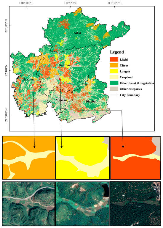 In terms of area, the extracted area of litchi fruit trees matches the officially reported area in Maoming. However, due to the differences in the growth cycles of different litchi species, the method will incorrectly identify some litchi fruit trees as non-litchi fruit trees. Overall, the method in this paper possesses high accuracy in the identification of litchi, other forest and vegetation, and cropland. Due to the insufficient sampling sites of longan and citrus, the extraction of spatial distribution information of these two fruit trees was not assessed. These were also the main shortcomings of this study.