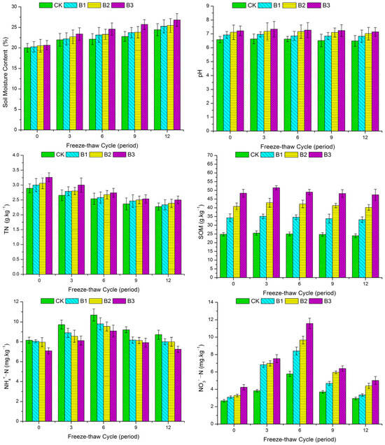 Soil quality indicators under freeze–thaw cycles (FTCs). TN, total nitrogen; SOM, soil organic matter; NH4+-N, soil ammonium nitrogen; NO3−-N, soil nitrate nitrogen; MBC, microbial biomass carbon content; MBN, microbial biomass nitrogen content.