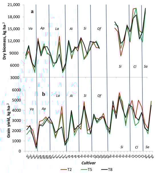 Trend of the total dry biomass (a) and grain yield (b) at the harvest of durum wheat following one another in the growing years for P_30. Va stands for Valgerardo, Ap for Appulo, La for Latino, Ai for Appio, Si for Simeto, Cl from Claudio, and Sa for Saragolla.