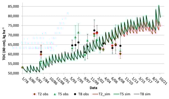 ARMOSA did not go far from the observed data, returning TOC values of 63,045 kg ha−1 and 65,247 kg ha−1 for NT and MT, respectively, for 2020.