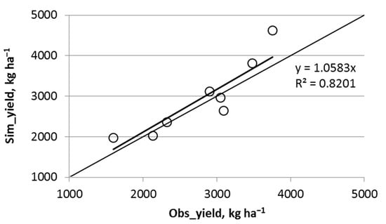 For the emergence, flowering, and maturity stages, an excellent match between the observed and simulated data was achieved, both in terms of similarity of values averaged for all growing seasons and in terms of inter-annual variability (Table 4).