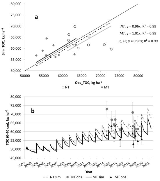 Linear regression between observed TOC (Obs_TOC) and simulated yield (Sim_TOC) achieved by NT (grey line), MT (thin black line), P_32 (dashed line) in the validation step (a); thin black line indicates 1:1 fit. TOC (0–40 cm) dynamics of observed (obs) and simulated (sim) NT and MT verified across experimental years of LTE (b).