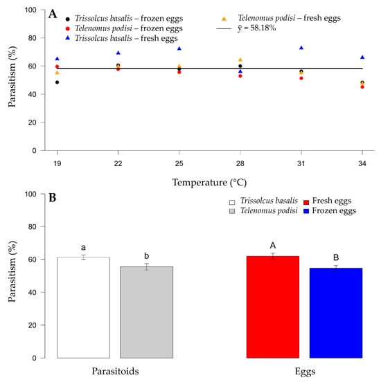 Parasitism of Trissolcus basalis and Telenomus podisi on frozen or fresh eggs of Euschistus heros at different constant temperatures, under laboratory conditions. Average for each combination of parasitoid and type of egg (A) (continuous line). Comparison of parasitism between parasitoids and type of egg (B). Bars followed by the same letter, lowercase (comparison of parasitoid species) or capital letters (comparison of egg types), do not differ statistically according to the F test (p > 0.05).