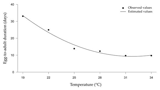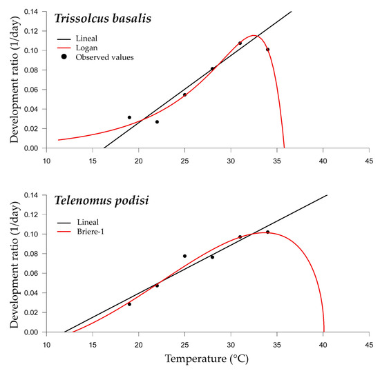 Calculations of the thermal requirements for parasitoid development were estimated using the base temperature (Tb) and the thermal constant (K), which were obtained from the duration of the development period (egg–adult) at the tested temperatures. The development rates of T. basalis and T. podisi as a function of temperature were analyzed using linear and nonlinear models (Table 1). The parameters included in each of the models were estimated by the Levenberg–Marquardt method, using the minpack.lm package [16] of the R computer application (version 3.5) [17]. The model with the best fit was selected based on the chi-square test of adherence (χ2), the adjusted coefficient of determination (adjR2), the logarithm of maximum likelihood (LogLik), the sum of squared residuals (RSS), and Akaike’s information criterion (AIC) and the Bayesian information criterion (BIC) and their respective weights (wAIC and wBIC, respectively).